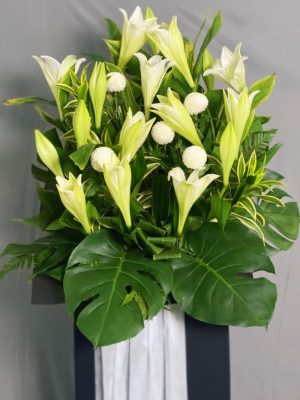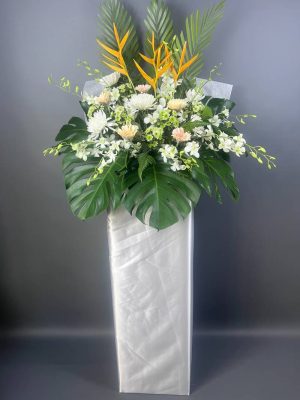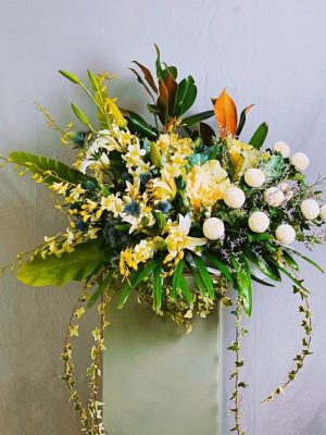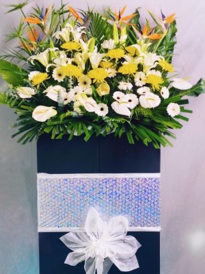 Bird Of Paradise, Marco White Lily, White Anthuriums, White Gerberas, Yellow Chrysanthemum With Foilage