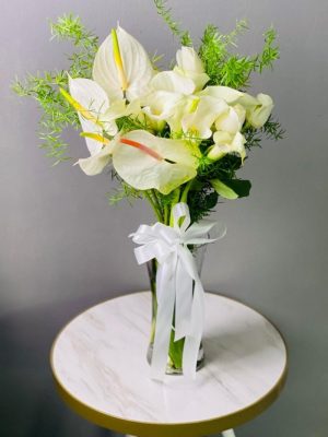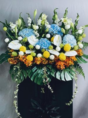 Anthurium, Gold Orchids, Green Bubble, Hydrangea, Ivy Leaves, Monstera, White Ball Chrysanthemum, White Easter Lily, White Mathiola, Yellow Chrysanthemum