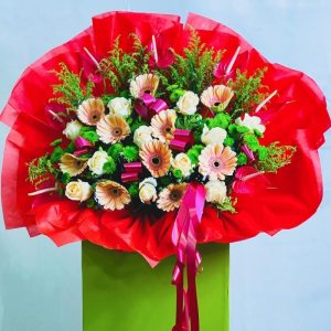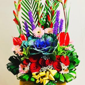 Anthurium, Gold Orchids, Green Bubble, Hydrangea, Ivy Leaves, Monstera, White Ball Chrysanthemum, White Easter Lily, White Mathiola, Yellow Chrysanthemum