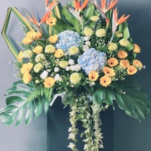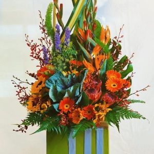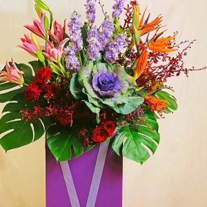 Bird Of Paradise, Brassica, Cabbage, Ivy Leaves, Monstera, Pink Chrysanthemum, Purple Orchids, Song Of India, White Orchids