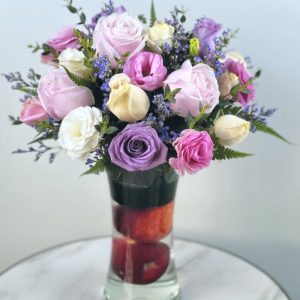 Cabbage, Champagne Rose, Ivy Leaves, Pink Chrysanthemum, Purple Eustoma, purple rose, White Chrysanthemum, White Lily, White Orchids