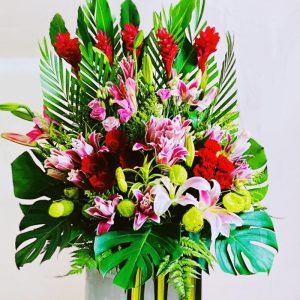 Anthurium, Gold Orchids, Green Bubble, Hydrangea, Ivy Leaves, Monstera, White Ball Chrysanthemum, White Easter Lily, White Mathiola, Yellow Chrysanthemum