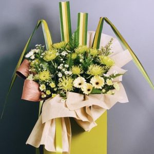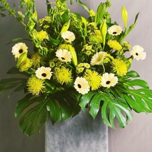 Green Chrysanthemum, Green Spider Chrysanthemum, White Marco Lily, White Poms, Yellow Gerberas, Yellow Phoenix