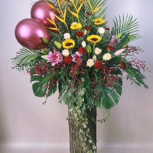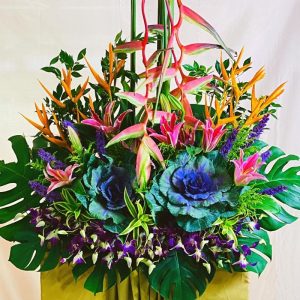 Foilage, Green Hydrangeas, Hawaiian Green Anthurium, Local Bird, Pink Lilies, red ginger, Sunflowers, Yellow Phoenix