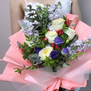 Cabbage, Champagne Rose, Ivy Leaves, Pink Chrysanthemum, Purple Eustoma, purple rose, White Chrysanthemum, White Lily, White Orchids
