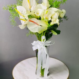 Bird Of Paradise, Marco White Lily, White Anthuriums, White Gerberas, Yellow Chrysanthemum With Foilage
