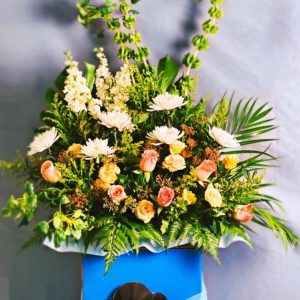 Cabbage, Champagne Rose, Ivy Leaves, Pink Chrysanthemum, Purple Eustoma, purple rose, White Chrysanthemum, White Lily, White Orchids