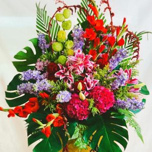 Anthurium, Gold Orchids, Green Bubble, Hydrangea, Ivy Leaves, Monstera, White Ball Chrysanthemum, White Easter Lily, White Mathiola, Yellow Chrysanthemum