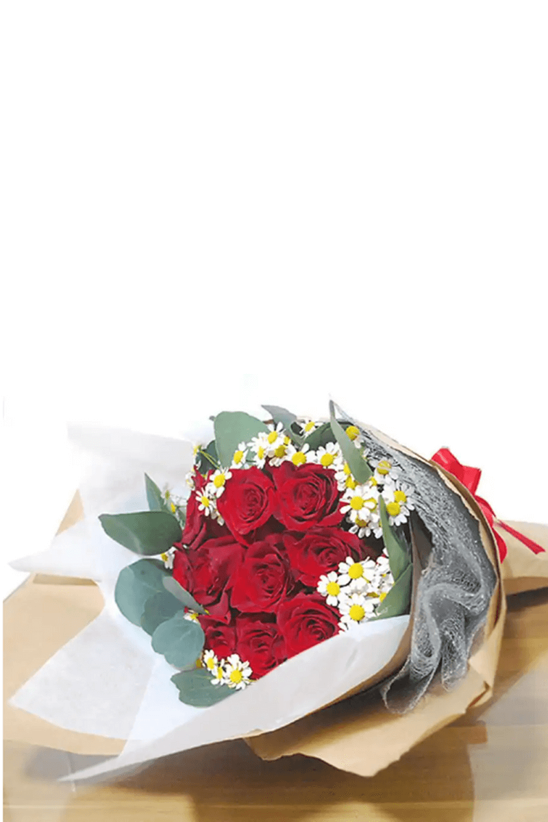 Red roses are a perfect and universal expression of love and passion. Paired up with these dainty daisies, it allows the red to stand out.